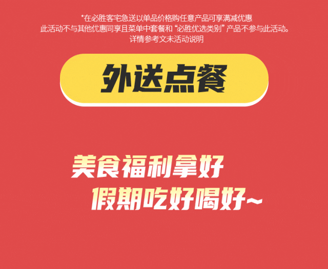 官网订餐指通过必胜客手机APP、手机WAP、必胜客及必胜客宅急送官方微信或官方支付宝订餐;活动不适用于机场、火车站、高速公路、旅游度假、游乐场、展览馆、奥特莱斯、精选餐厅、Les Elites以及部分必胜客特定餐厅,请详洽餐厅。活动优惠权益不与其他任何优惠共享。“单品价”产品不含菜单中的“特/惠/券”产品、套餐产品及必胜优选系列产品。图示内容仅供参考,产品及包装请以实物为准。必胜客宅急送不同送餐区域的菜单和价格有所不同,不同时段产品品项及价格有所不同,详情以输入送餐地址后显示的实际供应的菜单为准。 如遇活动套餐/产品售罄,将为您替换为相近套餐/产品。必胜客宅急送各门店均有送餐范围限制,若您的送餐地址不在送餐范围内,我们将无法为您提供外送服务,敬请谅解。