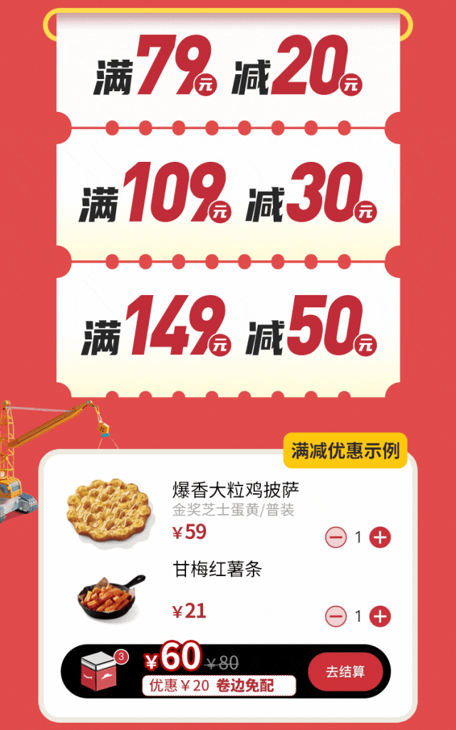 以单品价选购任意产品,且单笔实付金额满 79元可享立减20 元优惠一次;单笔实付金额满 109 元可享立减30元优惠一次;单笔实付金额满149元可享立减50元优惠一次,且单笔订单仅可享受一次满减优惠,系统将根据结算页面显示的实付金额自动匹配最大优惠活动。*本优惠活动不可同时使用且不与其他优惠同享且菜单中套餐和“必胜优选类别”产品不参与此活动。全品类非折扣美味在活动期间价满立减。