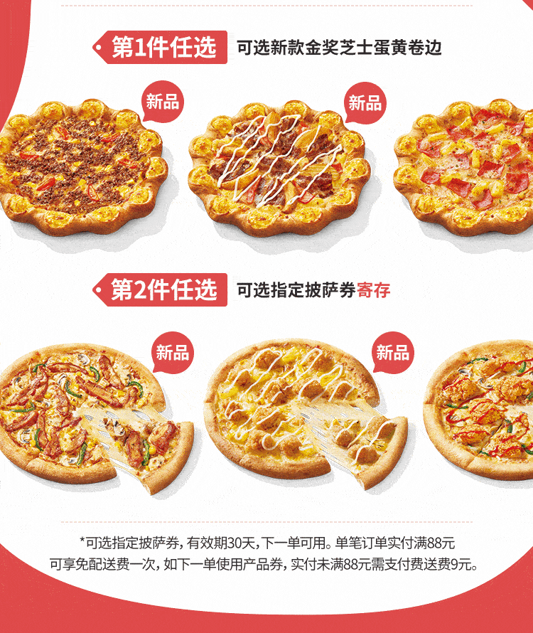 通过必胜客宅急送官方网络订餐,以单品正价选购任意卷边普装披萨单品(菜单中套餐及“必胜聚划算活动”除外),可享立减配送费9元优惠。必胜客宅急送部分门店不参与以上活动,具体以输入送餐地址后显示的菜单为准。