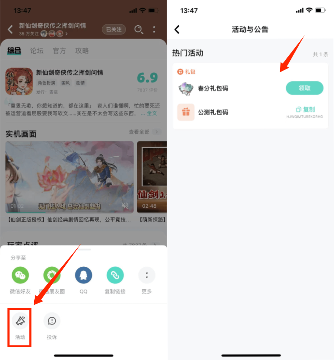 ▼苹果手机领取方法:在游戏详情页中,点击右上角两点,再点击弹窗的“活动”,即可领取福利礼包!