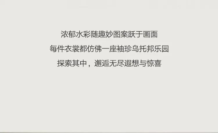 摘要:夏日精灵在草丛狂欢\x0d\x0a浓郁水彩随趣妙图案跃于画面\x0d\x0a每件衣裳都仿佛一座袖珍 乌托邦乐园\x0d\x0a探索其中,邂逅无尽遐想与惊喜