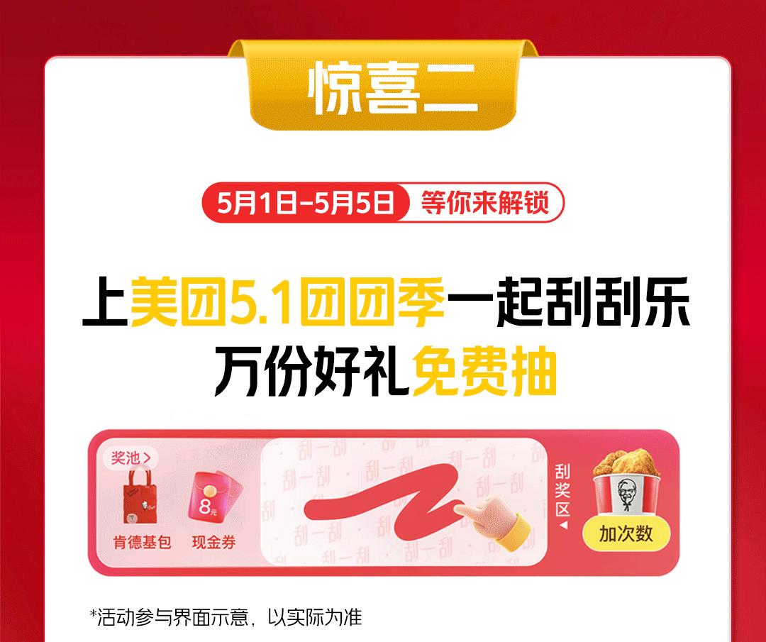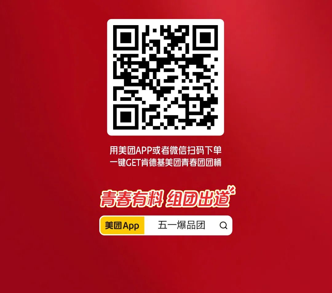 2024年5月1日-2024年5月5日,购买【送TNT周边】美团青春团团桶1份,即可随餐得时代少年团美团定制明信片1份。每单限购1份。预约单不参加本活动。套餐含:香辣鸡腿堡1份+黄金SPA鸡排堡(藤椒风味)1份+老北京鸡肉卷1份+黄金脆皮鸡1份+劲爆鸡米花(大)1份+热辣香骨鸡(3块)1份+葡式蛋挞(经典)1只+百事可乐(中)2杯+九珍果汁饮料1杯+时代少年团美团定制明信片1份。明信片共限量2.4万份,数量有限,随餐发完即止,相应套餐随即结束售卖。产品及包装以实物为准。活动渠道:外送-肯德基宅急送美团外卖平台。活动时间:9:30-23:00。活动地区:重庆市指定肯德基餐厅,不适用于交通枢纽、旅游景区的餐厅及精选餐厅等部分餐厅。外送部分送餐区域不供应此产品,详情以输入地址后显示的菜单及送餐时间为准。除推广产品外,其他物品仅做装饰目的,图示内容仅供参考。不与其他优惠共享。堂食、肯德基宅急送自有渠道、第三方外卖平台外送渠道、甜品站、团购渠道、企业送渠道及其他渠道的产品组合、价格及优惠活动,以各渠道页面展示为准。吮指原味鸡/黄金脆皮鸡出餐部位随机搭配。配送费及打包服务费需自理。