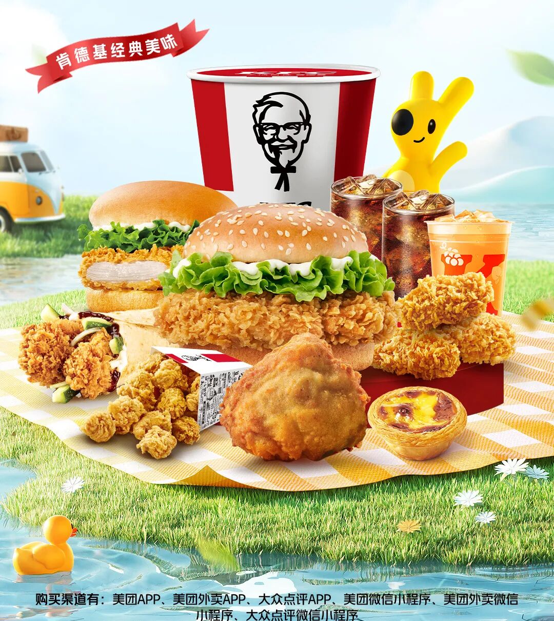 2024年4月27日-2024年5月5日,可以59元购买美团青春团团桶1份。套餐含:香辣鸡腿堡/劲脆鸡腿堡1份、黄金SPA鸡排堡(藤椒风味)1份、老北京鸡肉卷1份、黄金脆皮鸡/吮指原味鸡1份、劲爆鸡米花(大)1份、热辣香骨鸡(3块)1份、葡式蛋挞(经典)1只、百事可乐(中)2杯、九珍果汁饮料1杯。每单限购1份优惠套餐。活动渠道:外送-肯德基宅急送美团外卖平台。活动时间:9:30-23:00。活动地区:全国。外送部分送餐区域不供应此产品,详情以输入地址后显示的菜单及送餐时间为准。除推广产品外,其他物品仅做装饰目的,图示内容仅供参考。产品、周边、玩具及包装以实物为准。不与其他优惠共享。堂食、肯德基宅急送自有渠道、第三方外卖平台外送渠道、甜品站、团购渠道、企业送渠道及其他渠道的产品组合、价格及优惠活动,以各渠道页面展示为准。吮指原味鸡/黄金脆皮鸡出餐部位随机搭配。配送费及打包服务费需自理。