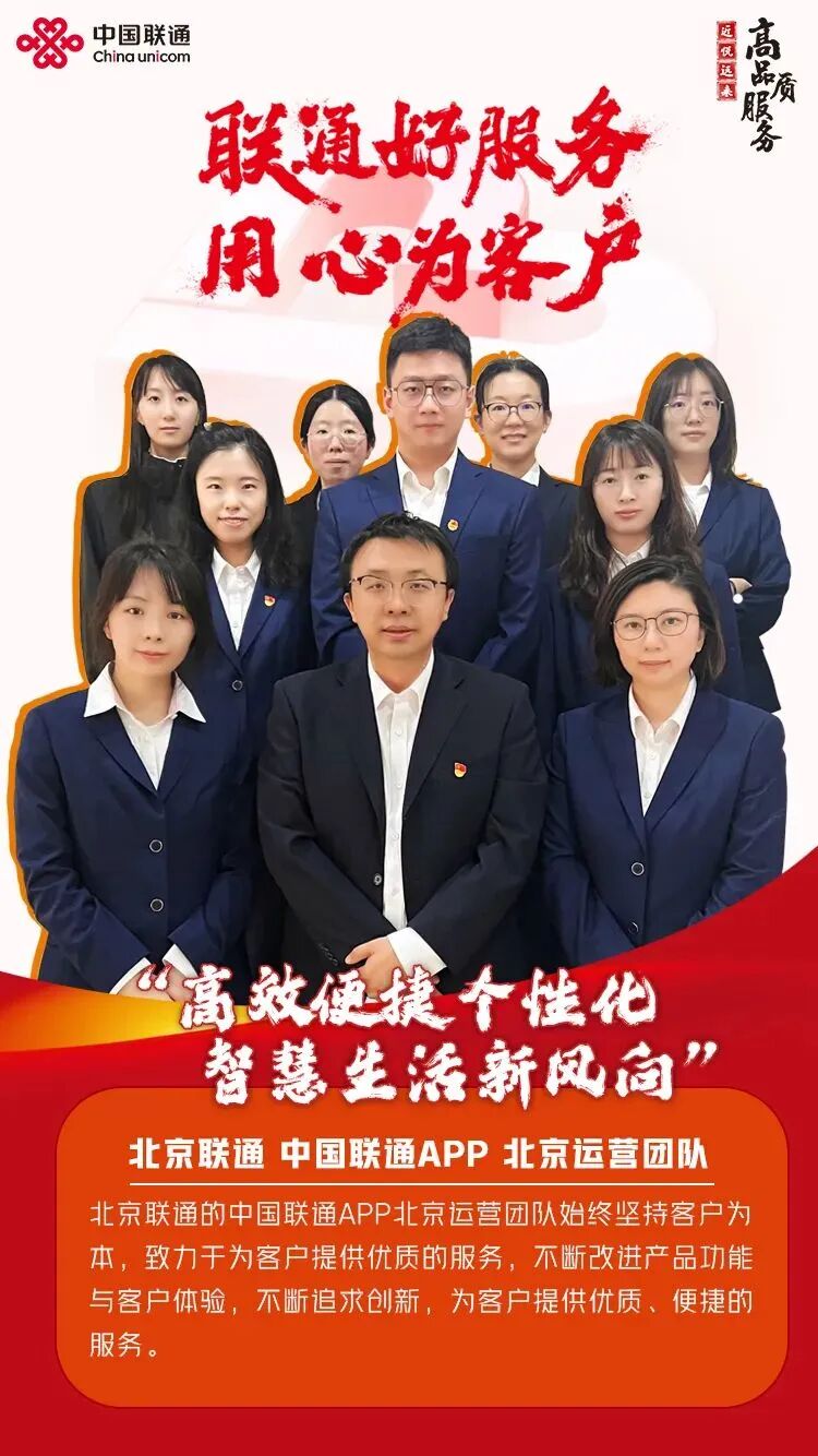 中国联通APP北京运营团队始终秉持“客户至上”的宗旨,致力于为客户提供优质的服务,不断改进产品功能与客户体验。在不断地追求创新的同事,为客户提供优质、便捷的服务。