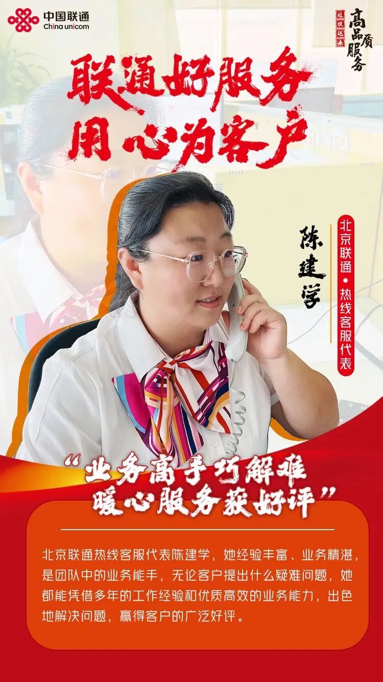 北京联通热线客服代表陈建学,她经验丰富、业务精湛,是团队中的业务能手,无论客户提出什么疑难问题,她都能凭借多年的工作经验和优质高效的业务能力,出色地解决问题,赢得客户的广泛好评。
