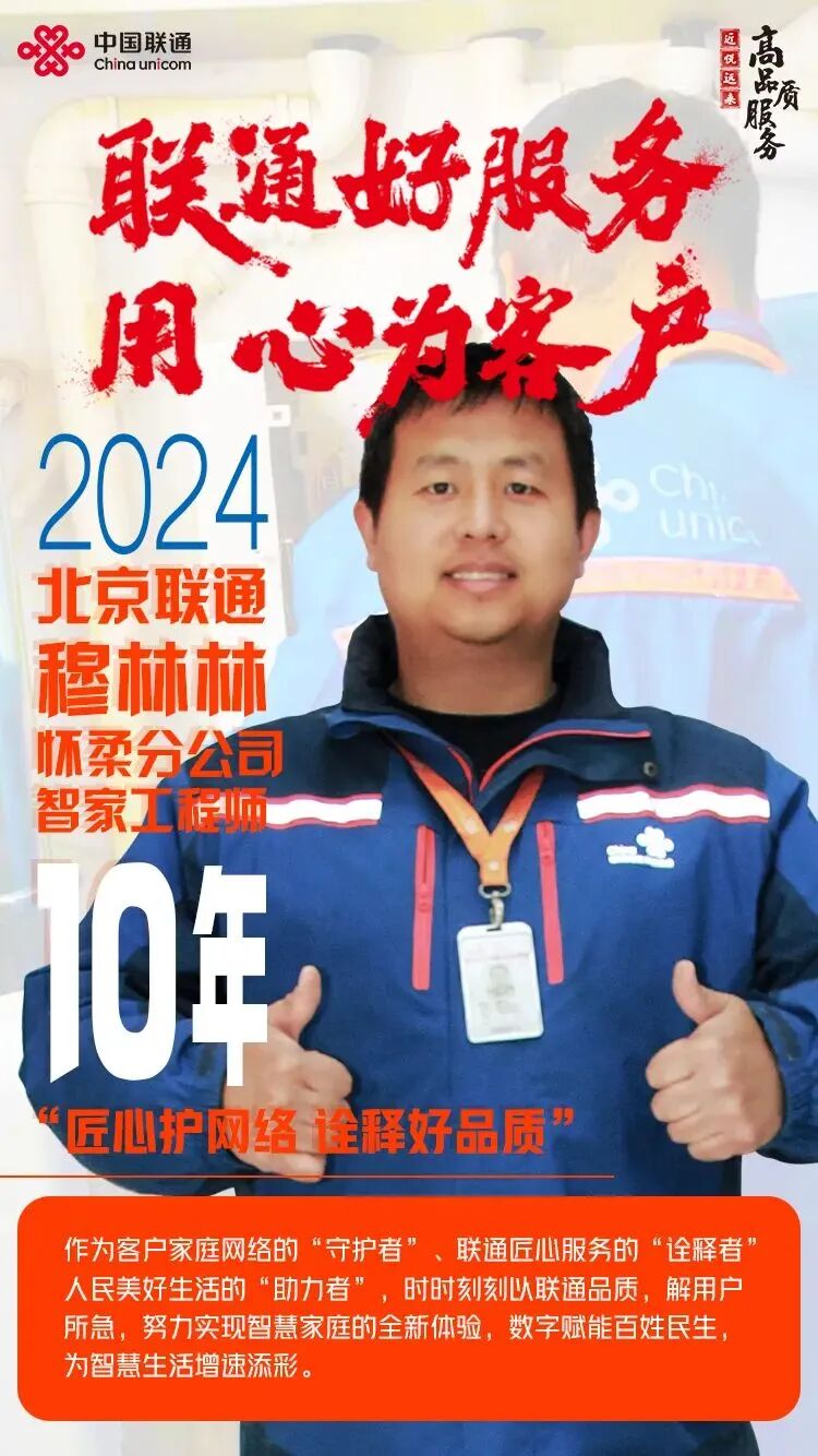 北京联通智家工程师穆林林,作为客户家庭网络的“守护者”、联通匠心服务的“诠释者”、人民美好生活的“助力者”,十几年如一日坚持服务为上,急用户之所急,想用户之所想。他认真细致的工作态度得到广大客户地高度认可,“联通小穆”已经成为了一张代表联通好服务形象的崭新名片。