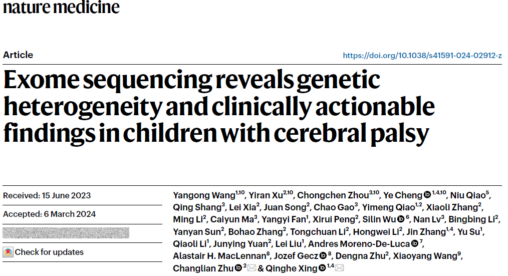 2024年5月1日,复旦大学生物医学研究院邢清和教授团队与郑州大学第三附属医院朱长连教授团队合作在Nature Medicine杂志以研究长文形式发表题为 “Exome-sequencing reveals genetic heterogeneity and clinically actionable findings in children with cerebral palsy”的研究论文。该研究系统地揭示了中国人群脑瘫患者的遗传学特征,完善了脑瘫相关基因谱和突变谱,为脑瘫的基因诊断、个体化治疗、生育咨询和相关机制研究提供了重要参考依据,也为开展脑瘫的早诊断、早干预或新生儿筛查创造了条件。