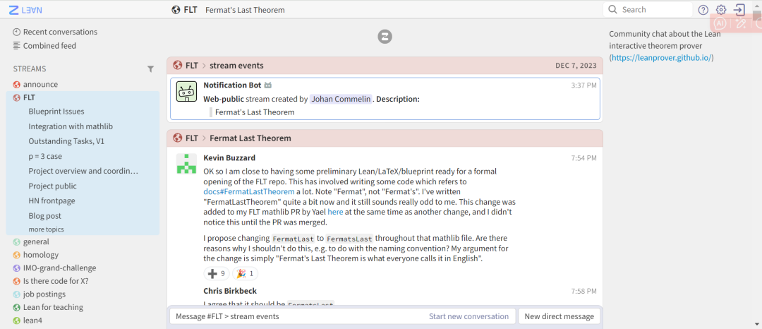 该项目将在 Lean Zulip chat 的 FLT stream 上进行,这是一个强大的研究论坛,数学家和计算机科学家可以实时协作,轻松地发布代码和数学,使用线程和 stream 系统,有效地支持多场独立对话同时进行。