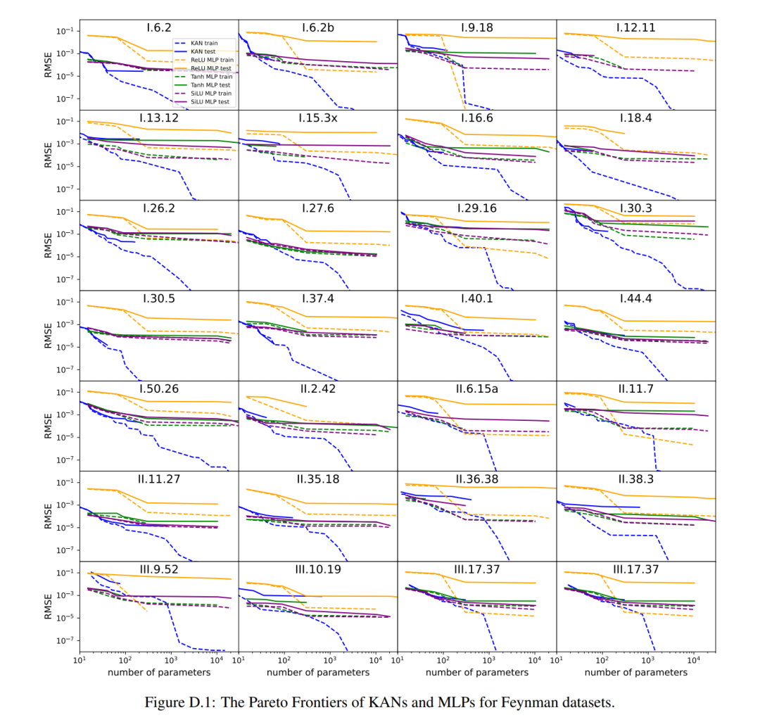他们发现 MLP 和 KAN 平均表现相当。对于每个数据集和每个模型族(KAN 或 MLP),作者在参数数量和 RMSE 损失构成的平面上绘制了帕累托边界,如图 D.1 所示。他们推测费曼数据集太简单,无法让 KAN 做出进一步改进,在这个意义上,变量依赖通常是平滑的或单调的,这与特殊函数的复杂性形成对比,特殊函数经常表现出振荡行为。