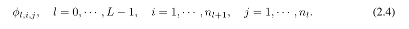 其中,n_i 是计算图第 i 层的节点数。这里用 (l, i) 表示第 l 层的第 i 个神经元,用 x_l,i 表示 (l, i) 神经元的激活值。在第 l 层和第 l + 1 层之间,有 n_l*n_l+1 个激活函数:连接 (l, j) 和 (l + 1, i) 的激活函数表示为