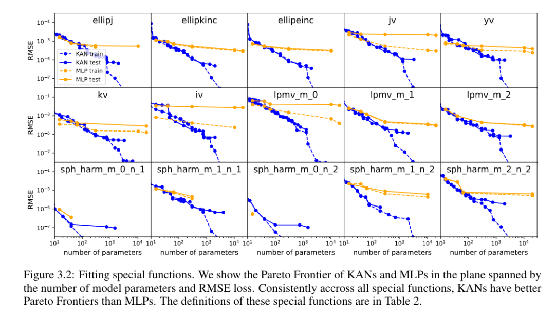 对于每个数据集和每个模型族(KAN 或 MLP),作者在参数数量和 RMSE 平面上绘制了帕累托边界,如图 3.2 所示。