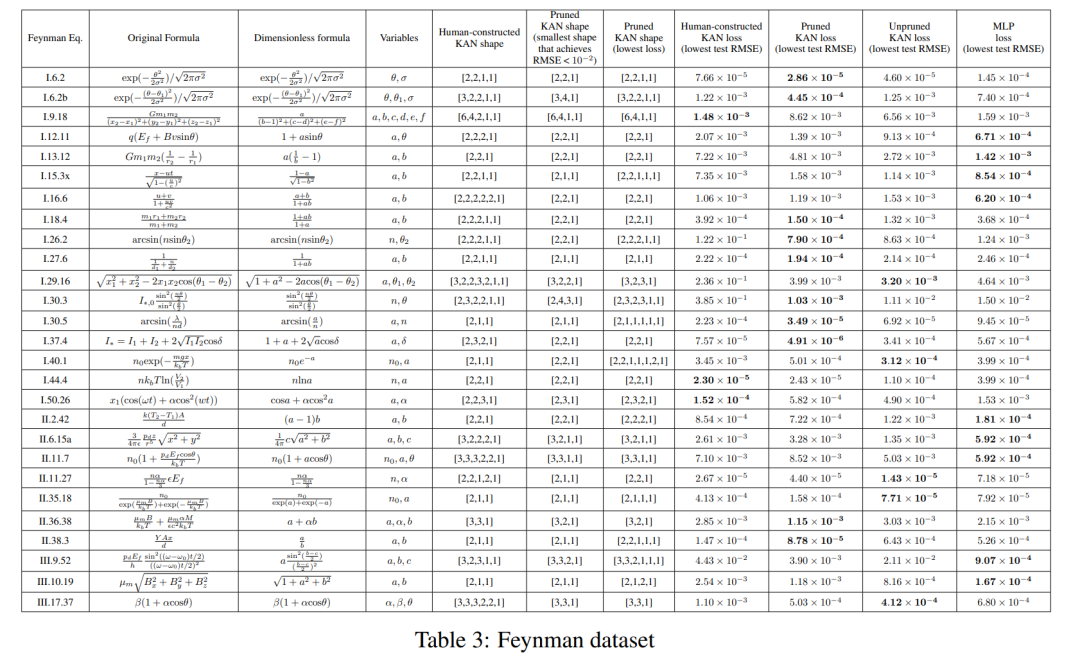 对于每种超参数组合,作者尝试了 3 个随机种子。对于每个数据集(方程)和每种方法,他们在表 3 中报告了最佳模型(最小 KAN 形状或最低测试损失)在随机种子和深度上的结果。