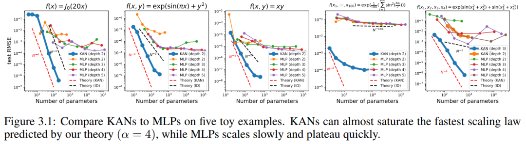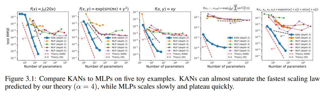 我们在图 3.1 中绘制了 KAN 和 MLP 的测试 RMSE 作为参数数量的函数,展示了 KAN 比 MLP 有更好的缩放曲线,特别是在高维示例中。为了比较,作者绘制了根据他们的 KAN 理论预测的线条,为红色虚线(α = k + 1 = 4),以及根据 Sharma & Kaplan [17] 预测的线条,为黑色虚线(α = (k + 1)/d = 4/d)。KAN 几乎可以填满更陡峭的红色线条,而 MLP 甚至难以以更慢的黑色线条的速度收敛,并迅速达到平台期。作者还注意到,对于最后一个示例,2 层 KAN 的表现远不如 3 层 KAN(形状为 [4, 2, 2, 1])。这突出了更深的 KAN 有更强的表达能力,对于 MLP 也是如此:更深的 MLP 比更浅的 MLP 具有更强的表达能力。