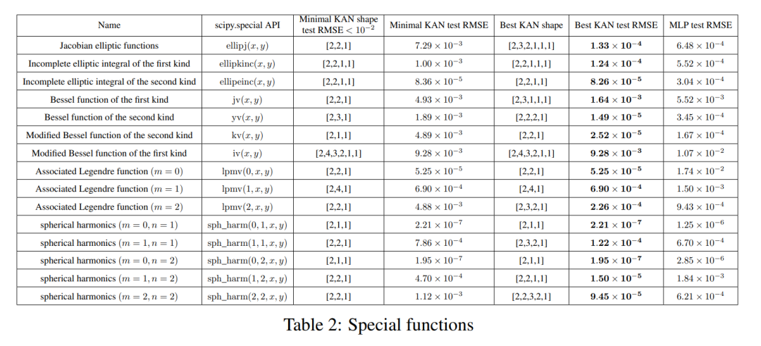 KAN 的性能一致优于 MLP,即在相同数量的参数下,KAN 能够实现比 MLP 更低的训练 / 测试损失。此外,作者在表 2 中报告了他们自动发现的特殊函数的 KAN(出人意料地紧凑)的形状。一方面,从数学上解释这些紧凑表示的意义是有趣的。另一方面,这些紧凑表示意味着有可能将一个高维查找表分解为几个一维查找表,这可以潜在地节省大量内存,而在推理时执行一些加法运算的开销(几乎可以忽略不计)。