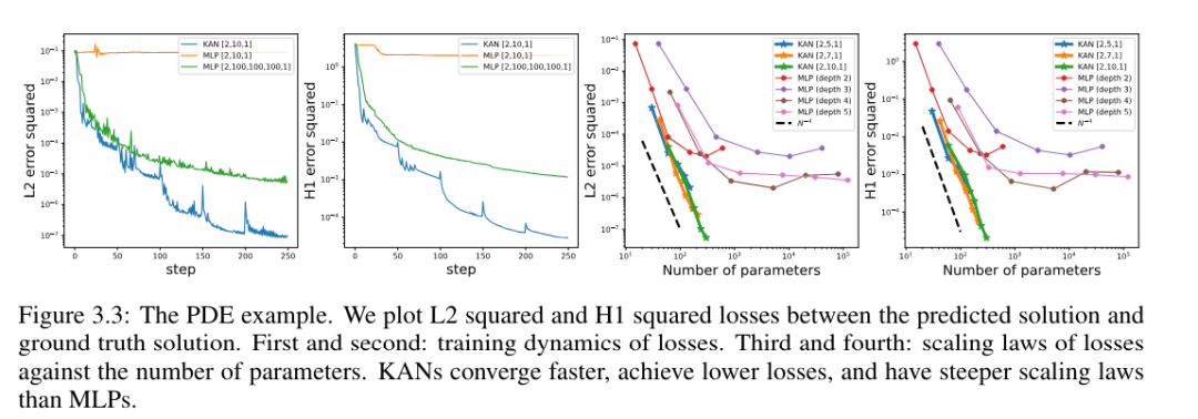 作者使用相同的超参数,比较了 KAN 与 MLP 架构。他们测量了 L^2 norm 和能量(H^1)norm 的误差,并观察到 KAN 在使用更小的网络和更少的参数的情况下,实现了更好的 scaling law 和更小的误差,见图 3.3。因此,他们推测 KAN 可能有潜力作为偏微分方程(PDE)模型约简的良好神经网络表示。