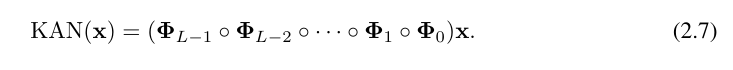 其中,Φ_l 是对应于第 l 层 KAN 层的函数矩阵。一个通用的 KAN 网络是 L 层的组合:给定一个输入向量 x_0 ∈ R^n0,KAN 的输出是