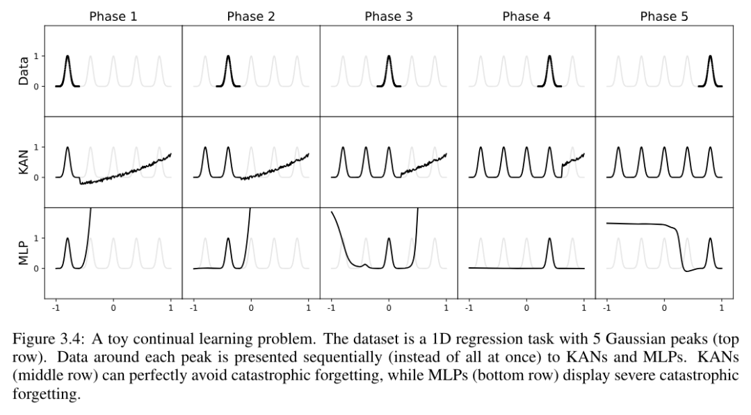 作者使用了一个简单的示例来验证这种直觉。一个一维回归任务由 5 个高斯峰组成。每个峰周围的数据是顺序呈现的(而不是一次性全部呈现),如图 3.4 顶部行所示,这些数据分别呈现给 KAN 和 MLP。KAN 和 MLP 在每个训练阶段后的预测结果分别显示在中间和底部行。正如预期的那样,KAN 只重构当前阶段存在数据的区域,而保持之前的区域不变。相比之下,MLP 在看到新的数据样本后,会重构整个区域,导致灾难性遗忘。