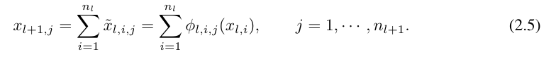 函数 ϕ_l,i,j 的预激活值简单表示为 x_l,i;ϕ_l,i,j 的后激活值为≡ ϕ_l,i,j (x_l,i)。第 (l + 1, j) 神经元的激活值是所有传入后激活值的总和: