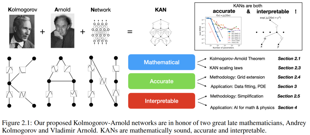 在本篇论文中,研究者展示了大量的实验数值,体现了 KAN 在准确性和可解释性方面对 MLP 的显著改进。论文的结构如下图 2.1 所示。代码可在 https://github.com/KindXiaoming/pykan 获取,也可以通过 pip install pykan 安装。