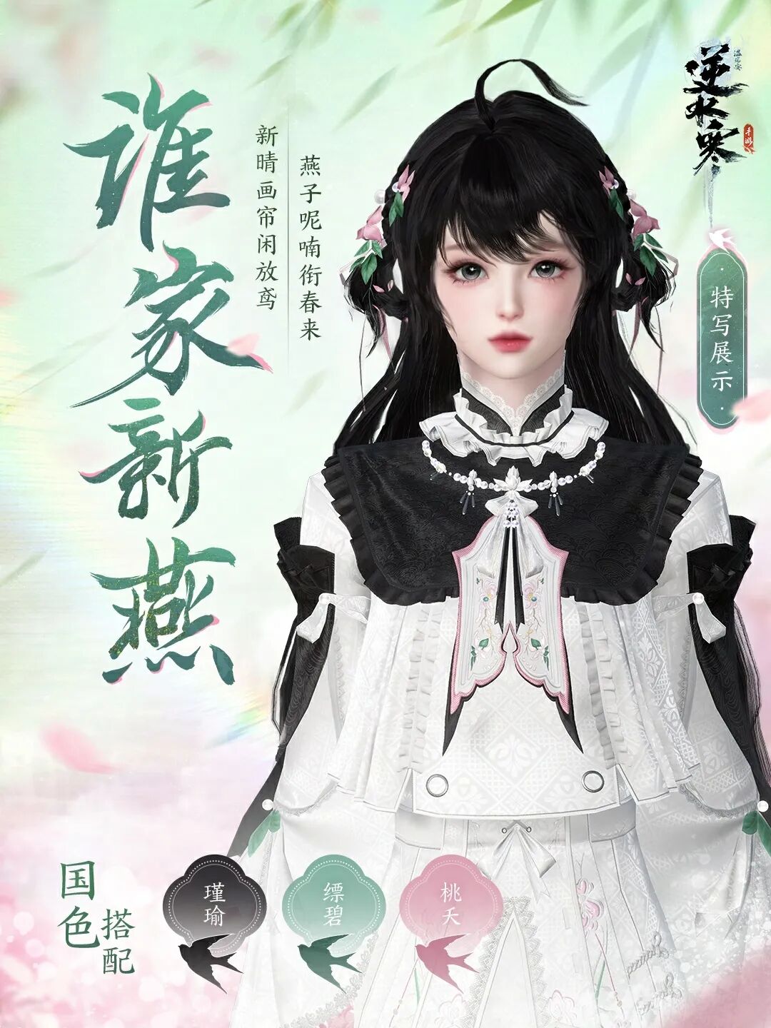 新晴画帘闲放鸢,燕子呢喃衔春来。全新纸鸢主题时装【谁家新燕】带着春光的美好明媚与新燕的温柔呢喃,轻灵地降临逆水寒的江湖。