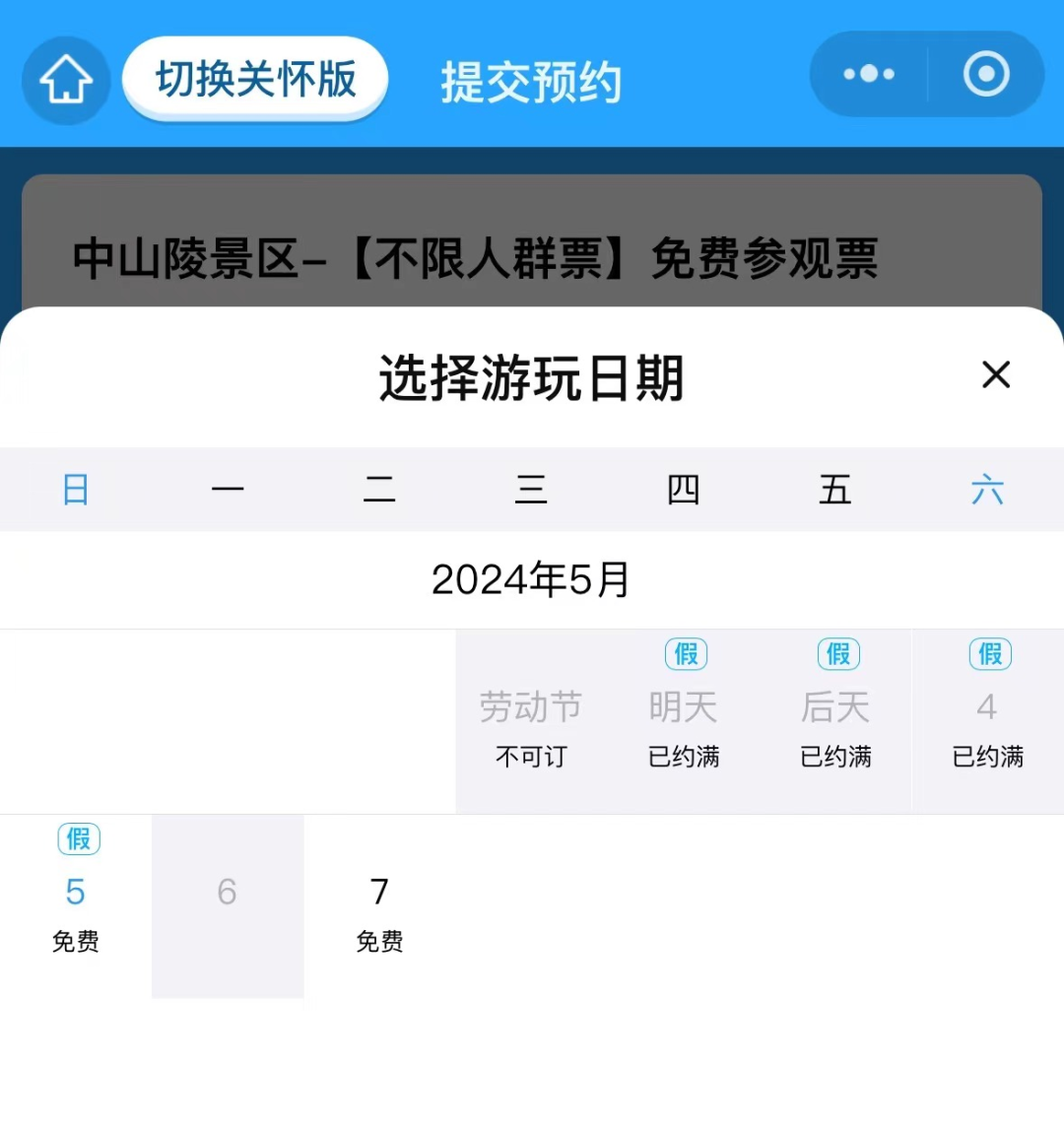 中山陵景区实行预约参观,5月5日还有余票,假期前四天显示“已约满”。