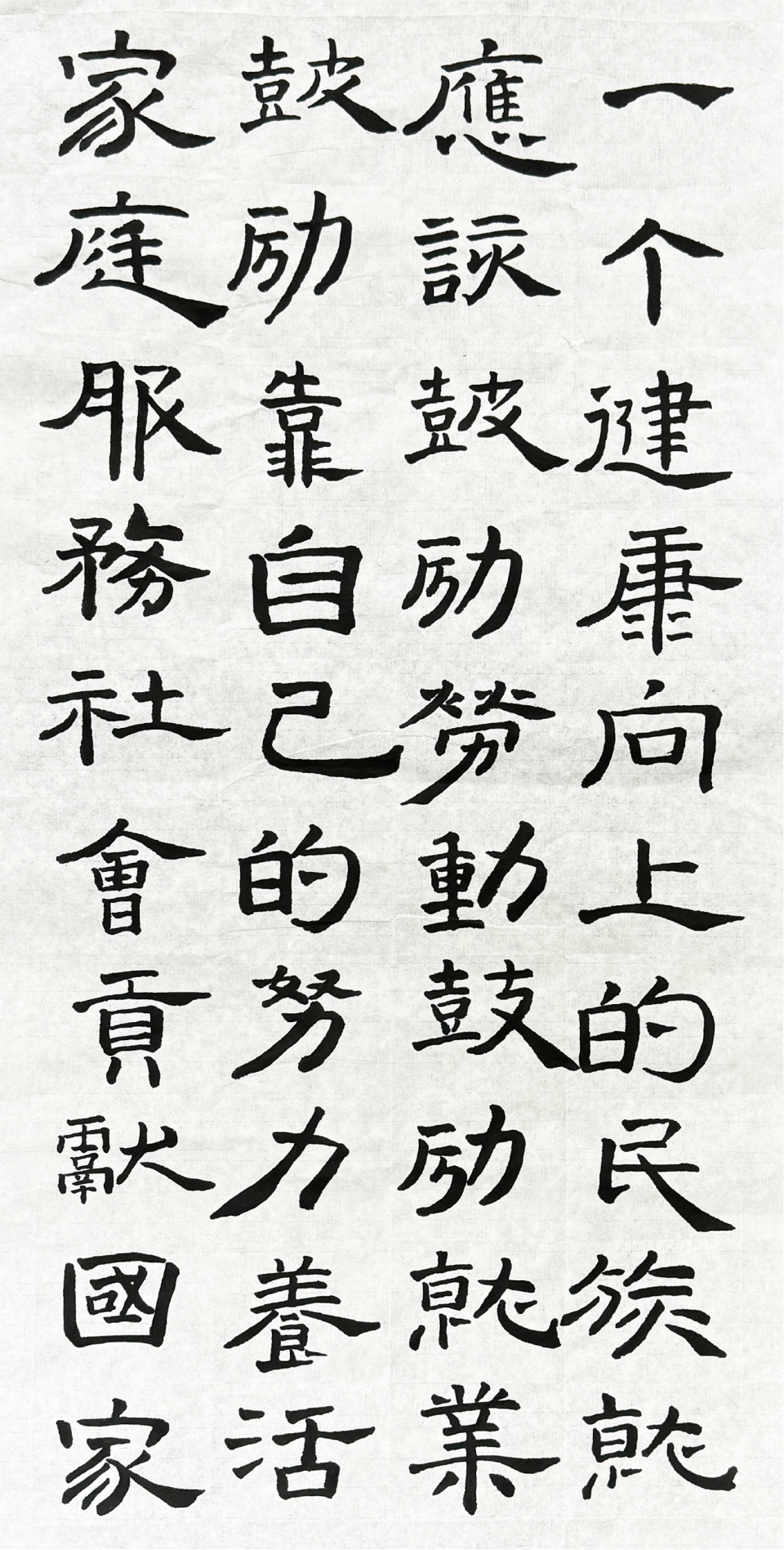 兴声:书写毛泽东的《沁园春·雪》时,我沉浸在那份豪情壮志与磅礴气势中。每笔每划都仿佛蕴含了革命领袖的博大胸怀和深远思考,让我仿佛穿越回了那个风雪交加的年代。在书写过程中,我感受到了“望长城内外,惟余莽莽;大河上下,顿失滔滔”的北国风光,那份对祖国山河的深深热爱油然而生。特别是“数风流人物,还看今朝”这句,仿佛一道闪电,照亮了我心中的黑暗,让我看到了毛泽东的坚定信念与宽广胸怀。