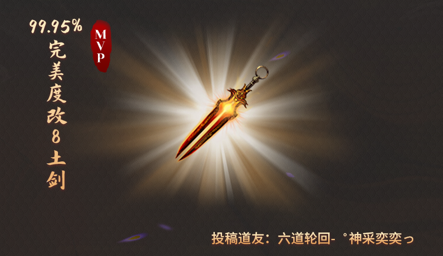 恭喜来自六道轮回-゜神采奕奕っ的极品改8土剑拔得今天的头筹!