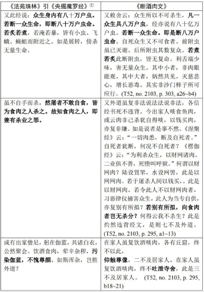 《断酒肉文》的风格是引经据典,夹杂议论,语气连贯而雄辩。第一段引文众生身上有八万户虫的说法,也见于今本《央掘魔罗经》。梁武帝引用了某种不知名的经,云有“八十亿万户”,我们当然可以设想可能在《断酒肉文》写作以前,已经存在一个文本,就是表5左栏所引的异本《央掘魔罗经》。但观察表5左栏文字,不难看出两段文字语意并不连贯,将出家僧尼与白衣、外道进行比较,更使人想起《断酒肉文》(表1段落1-B、段落1-C)独特的论辩方式。因此笔者认为,《法苑珠林》所引异本《央掘魔罗经》,很可能也就是智升所见到的疑伪经,它将《断酒肉文》的文字撮要、点窜,从而形成了比较简洁精炼的佛经式文体。