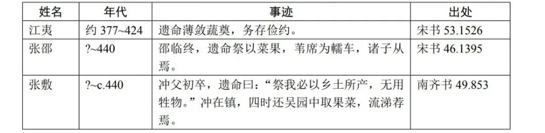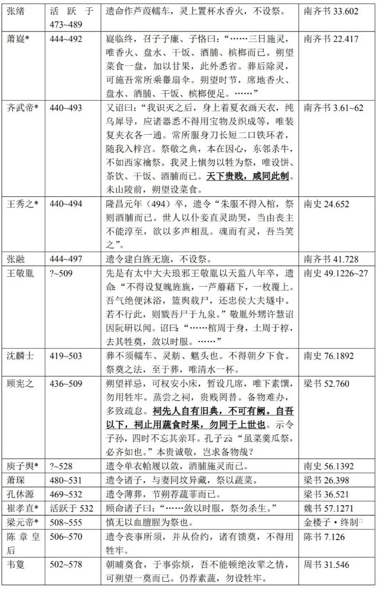 吉川忠夫系统地研读过唐前终制类作品,指出从汉代开始,士人中间流行薄葬的风俗。起初的考虑是自愧不能完成国家之职任,因而死后拒绝接受封赠。魏晋之际,则加入了人死是复归本真的道家观念。在薄葬观念的影响下,祭祀之物日趋简素。但如果以“牺牲—肉脯—蔬菜”作为标尺的话,祭祀素食化的关键转变大概发生在宋、齐两朝。