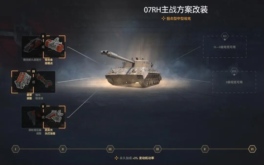 07RH主战方案属于狙击型中型坦克,战地升级达到满级后可以获得3%发动机功率加成。升级选项可以考虑轻合金挂载点、悬臂调整与防反光头灯涂层。配件方面可以选用改进型旋转装置/涡轮增压器/改进型通风系统/高级光学观察镜等中型坦克常用的配件。总结一下07RH主战方案的优缺点: