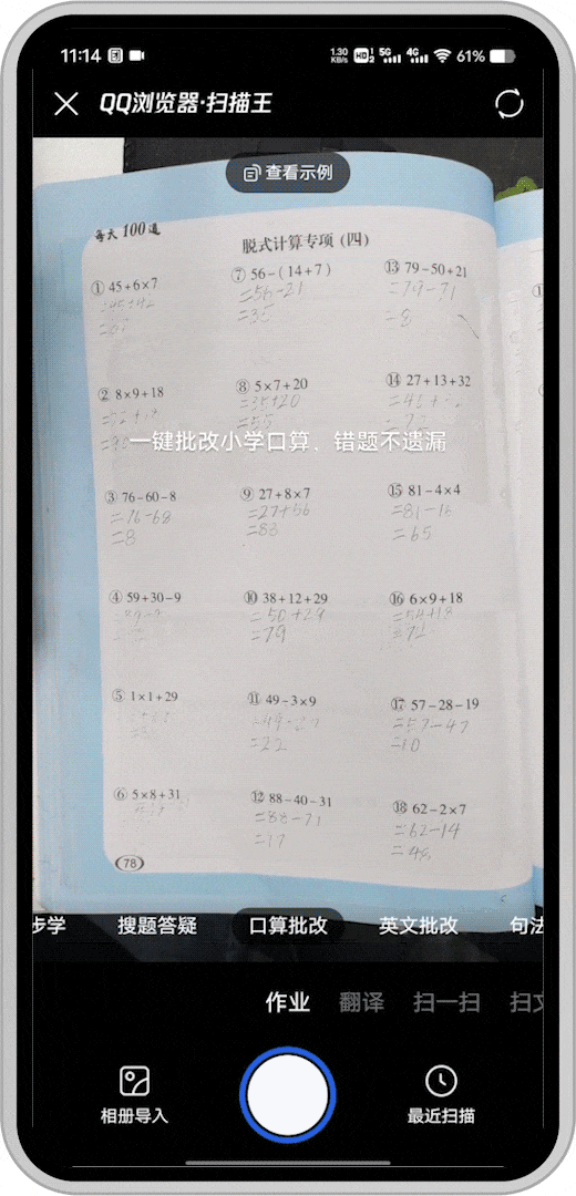 好不容易完成了听写,刚想松一口气,只见孩子从背后拿出了一沓做好的口算习题等我检查。这么多口算题一时批改不过来?交给它!QQ浏览器小学口算批改功能可以立刻完成题目批改,还支持识别四则混合运算、比较大小、分数运算多种运算题型,简直不要太给力!