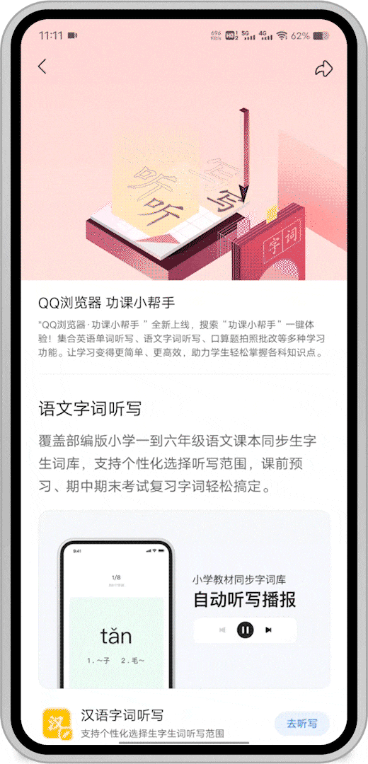 ○ QQ浏览器语文字词听写功能