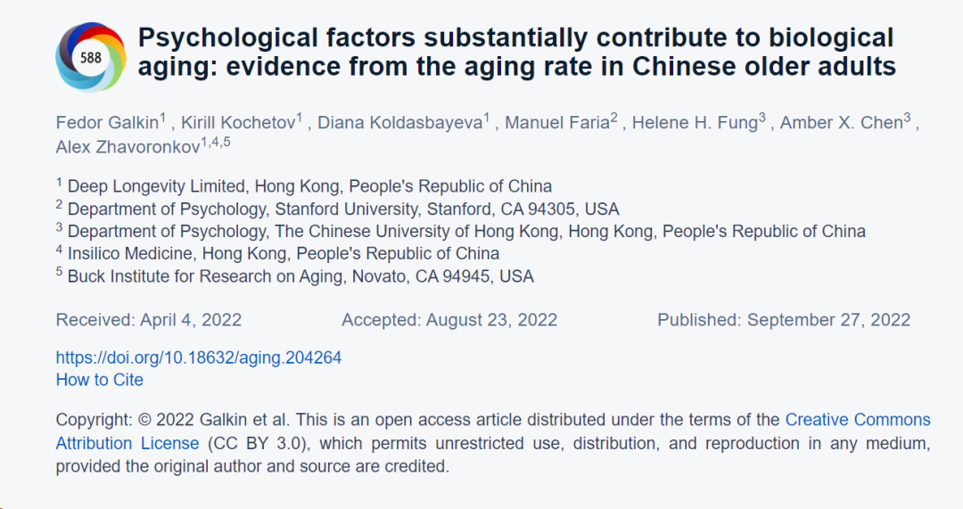 该研究证明了衰老时钟的生物学相关性。一个人的精神状态的总影响可以使生理衰老加速20个月(1.65岁)。