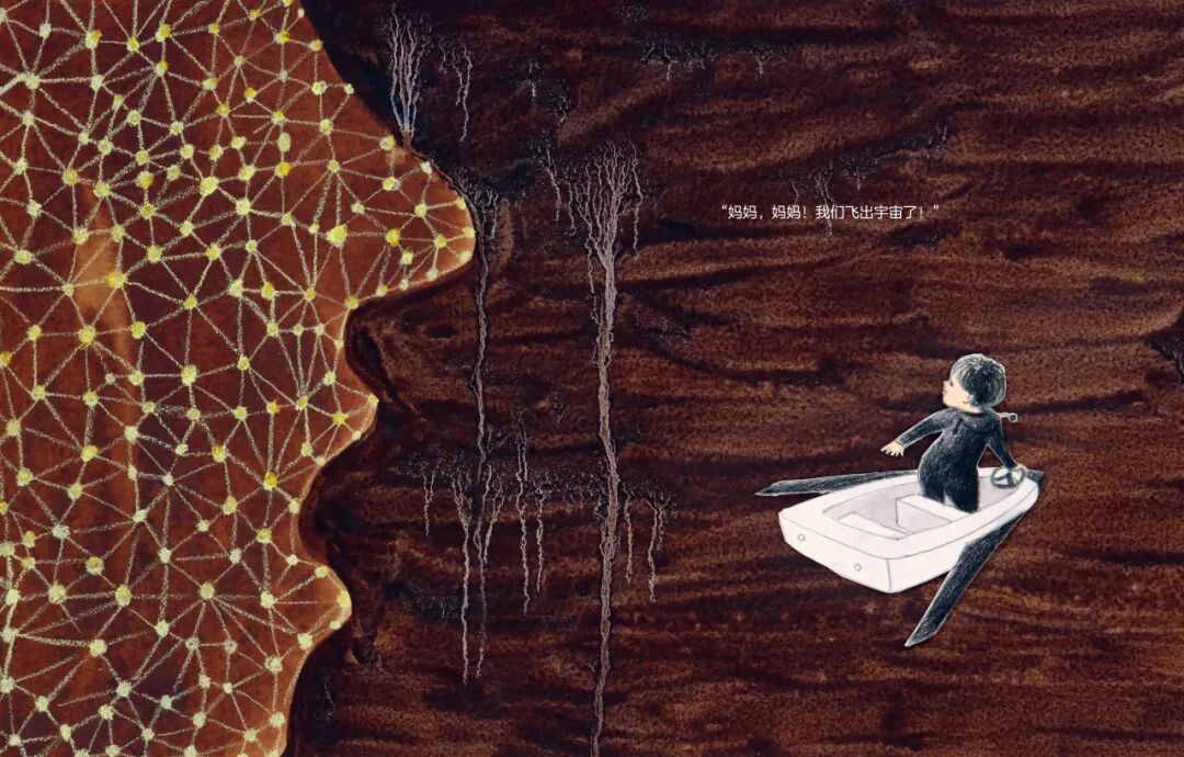 读到这一页的时候,孩子一下就会发现妈妈不见了。再打开他们没有觉得为什么宇宙是妈妈,为什么这样。他们觉得很自然,他们不会理解说这本书其实后面蕴含了很多的东西,他不会觉得为什么说妈妈是宇宙?他不会这么想,但是在每个孩子的心中,尤其是三岁之前的孩子,你会发现:母亲是他的全部,他和母亲是共生的,在心理学上也是被证明的。三岁以前妈妈要全方位的接纳孩子,然后妈妈跟孩子的关系预示着孩子未来跟世界的关系。这是心理学上也说过的,所以说孩子在看到妈妈像宇宙一样,他没有任何的不理解。因为对他们来说,妈妈就是很大,妈妈就是给他很多温暖,哭了、困了,在妈妈怀里一抱就什么事儿都没有了,所以大概是这样的一种感受。