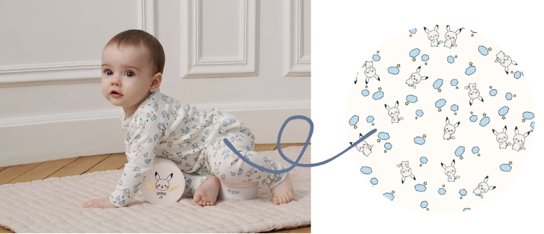 此次联名系列包含两款为1-36月龄宝宝设计的新生儿衣物。活泼可爱的皮卡丘图案印花,温暖点缀于睡衣和新生儿套装,闪耀星星与蓝色云朵浮动浪漫想象,以宝可梦世界的纯真活力,轻快跃动法式童年的俏皮、优雅与幸福。