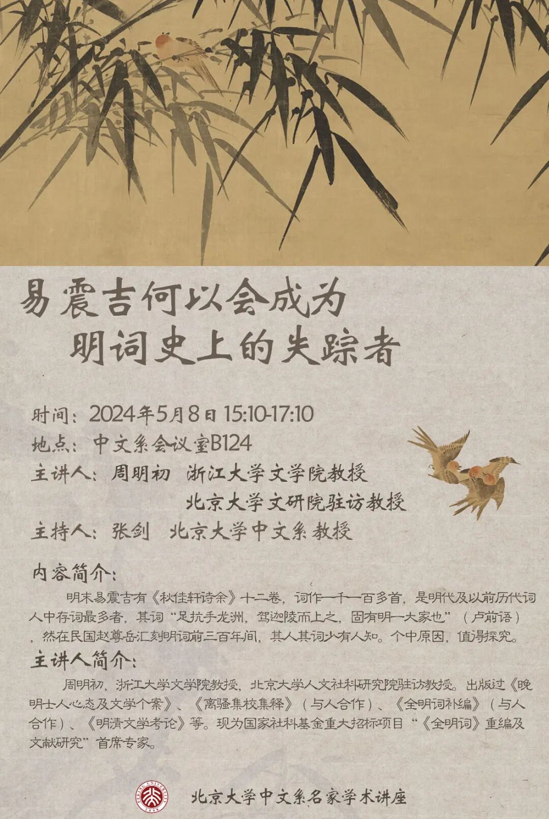 周明初,浙江大学文学院教授,北京大学人文社科研究院驻访教授。出版《晚明士人心态及文学个案》、《离骚集校集释》(与人合作)、《全明词补编》(与人合作)、《明清文学考论》等。国家社科基金重大招标项目“《全明词》重编及文献研究”首席专家。