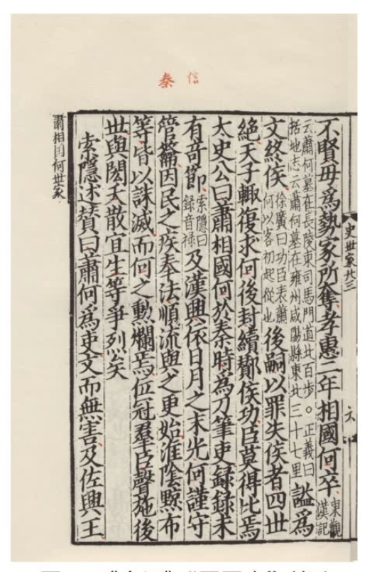 水泽利忠的《史记会注考证校补》提供了不少作“秦法”的校勘资料,有“南化”“枫”“棭”“梅”“绍”“详节”诸本,但作为文献学证据是否可靠,仍需具体分析。其中,“南化”“枫”“棭”“梅”四种都不是实际的版本,而是日本所藏南宋黄善夫、元代彭寅翁刻本上手写的标注,反映了日本室町至江户时代(约当明清)学者校读《史记》的成果。这些标注取材范围颇广,并不限于《史记》本书各卷和各个版本,而往往以他书参校。不少异文或来历不明,或可以确知不是出自《史记》。比如“南化”即“南化本”,指现藏日本国立历史民俗博物馆的南宋中期建安黄善夫刻三家注本《史记》,因曾归僧人南化玄兴而得名。此本现有日本汲古书院影印本和中国国家图书馆出版社的翻印本,正文原字仍作“奉”,而在板框下方栏外,标注“奉乍(作)秦”(见图1)。这未必来自《史记》的某个版本,而前后还有几个校字注记,如“谨乍(作)慎”“以乍(作)已”“羣乍(作)功”,都未见版本依据,需要慎重对待。另一套黄善夫刻本,为日本狩谷棭斋求古楼旧藏,现藏中国国家图书馆。此页与“南化本”显系同版,而在“奉”字上加朱点,书眉对应处标注“秦”字(见图2)。 同页还在“何谨守管籥”上标注了“信”字,显系据《汉书》“何以信谨守管籥”而校改。这个迹象提示,校“奉”为“秦”应该也是对勘《汉书》的结果。水泽利忠接下来提到的“详节”,指南宋吕祖谦所编《史记详节》;而“绍”则指南宋绍兴十年(1140)邵武朱中奉刊本《史记》。朱中奉本现仅存一部,藏日本武田科学振兴财团杏雨书屋,但一度在南宋颇有影响。水泽利忠说,此本独异的文字与《史记详节》的一致之处非常之多。我推测很可能这就是《史记详节》“奉”作“秦”的来源。如学者所说,朱中奉本校刻质量不高,错讹甚多。此本作“秦法”,或是无心之失,或是受《汉书》影响而改,是不足据以认定《史记》原文的。