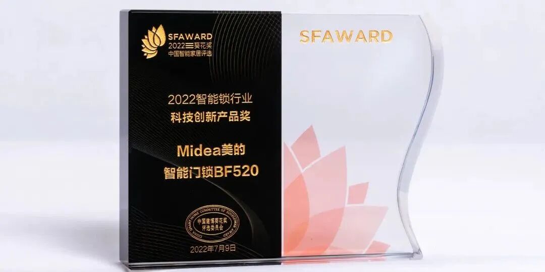 美的智能门锁一直坚持技术创新发展,深获业内的肯定与高度评价。2023年第七届葵花奖中国智能家居:智能锁行业领导力品牌 — Midea美的; 智能锁行业产品金奖 — 美的智能门锁 BF550 Plus;2022第六届葵花奖中国智能家居盛典上,美的智能门锁BF520首次参与即获评智能锁行业科技创新产品奖。
