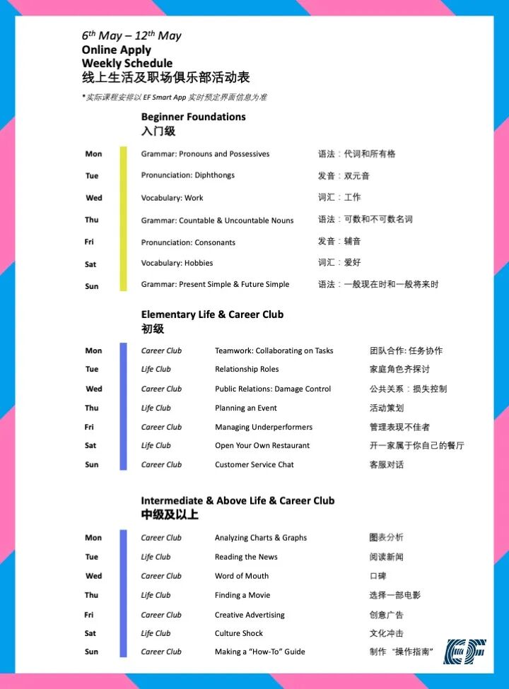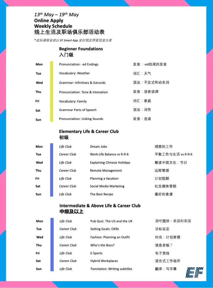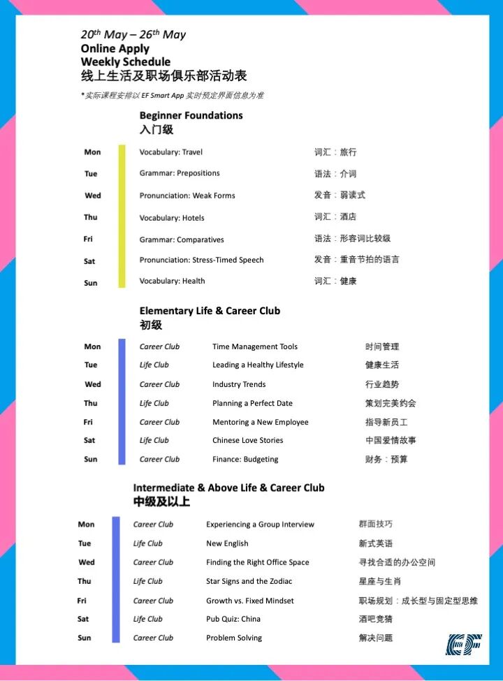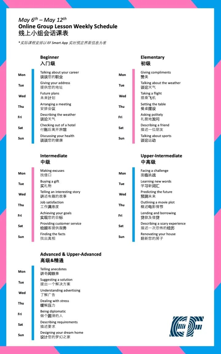 只需在本公众号EF教育集团官方后台回复关键词“课表”即可查询当月线上课程课表