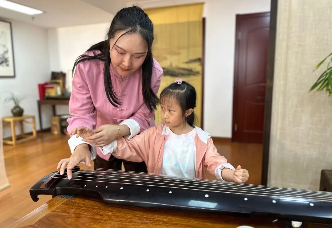 在互动环节,江老师带领孩子们试弹古琴,感受古琴文化的深厚底蕴。