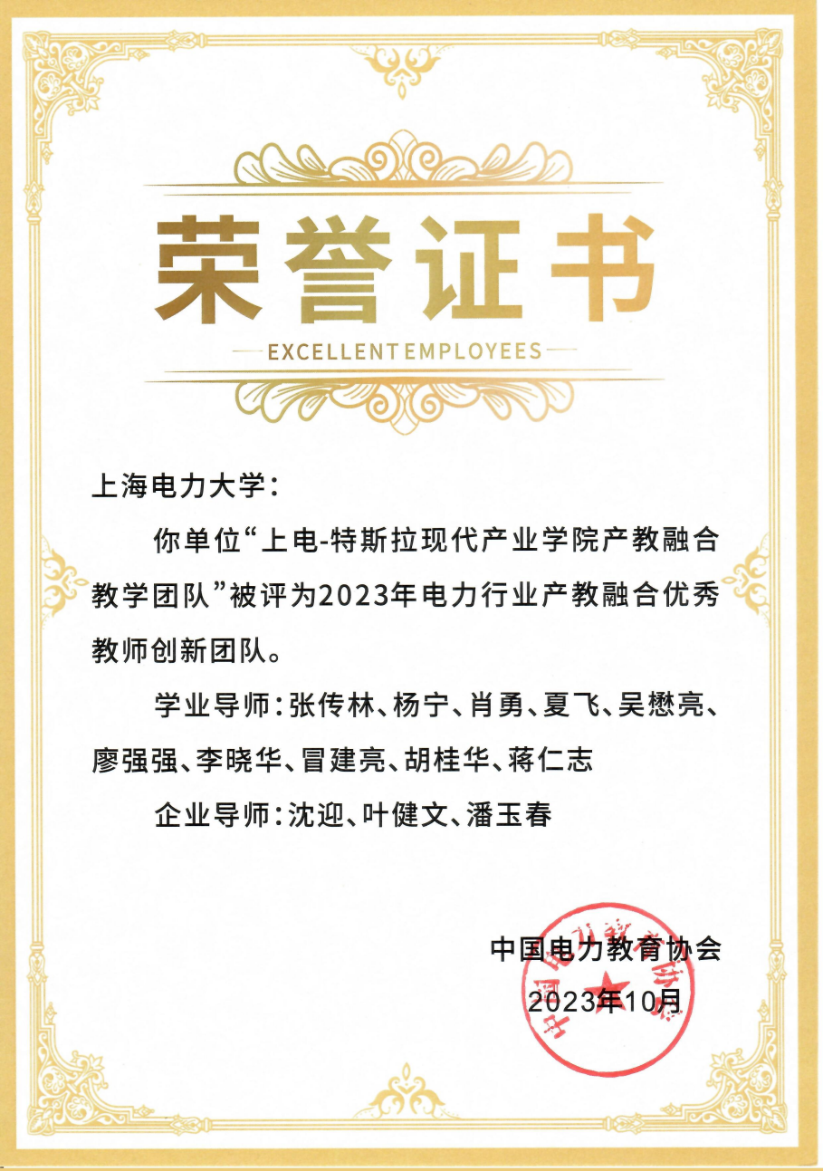 团队创办智能科学与技术新专业,建设上电-特斯拉现代产业学院,聚焦新型电力系统自主智能控制与感知等领域科学技术研究,先后获2022年我校自动化工程学院优秀团队、2023年中国电力教育协会电力行业产教融合优秀教师创新团队等荣誉称号。