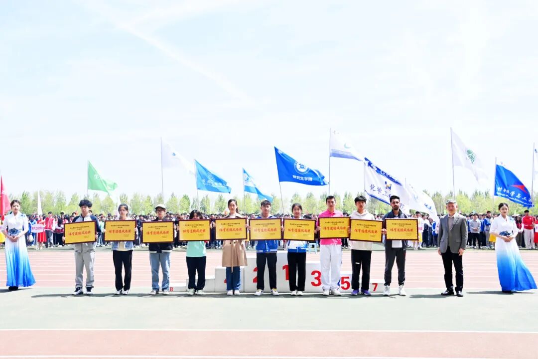 出席闭幕式的校领导分别为获得学男、学女、教工团体总分前八名和获得体育道德风尚奖的单位颁奖。
