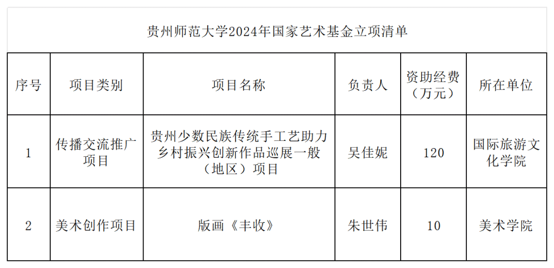 近日,国家艺术基金(一般项目)2024年度资助项目立项名单揭晓,我校国际旅游文化学院吴佳妮教授主持的《贵州少数民族传统手工艺助力乡村振兴创新作品巡展一般(地区)项目》获批传播交流推广项目,资助经费为120万元;美术学院朱世伟老师获批美术创作项目,资助经费为10万元。