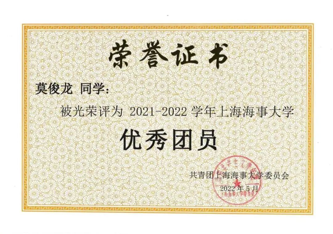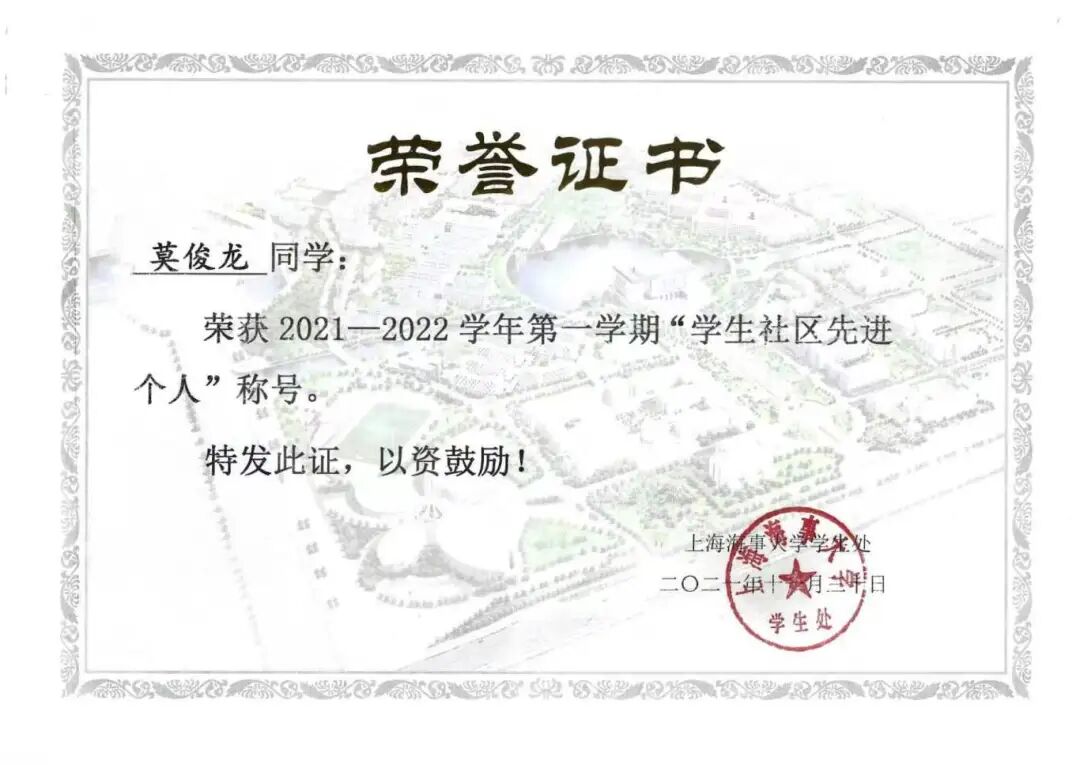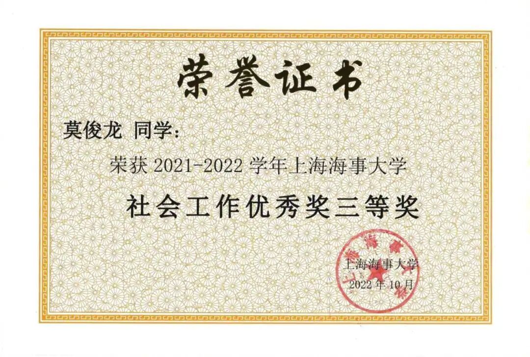 此外,莫俊龙同学还积极参加学生工作。他曾任信息工程学院学生会和团总支的骨干成员,并获优秀团干部等荣誉称号,在各种活动的筹备和工作的开展中,他的沟通能力、协调能力和大局观都得到了较大的提升。同时,身处海大这个机会众多的地方,他也积极参加了各种志愿者活动,在进博会等众多场所留下了自己的身影,拓宽了视野,也锻炼了自己的能力,使校园生活更加充满意义。