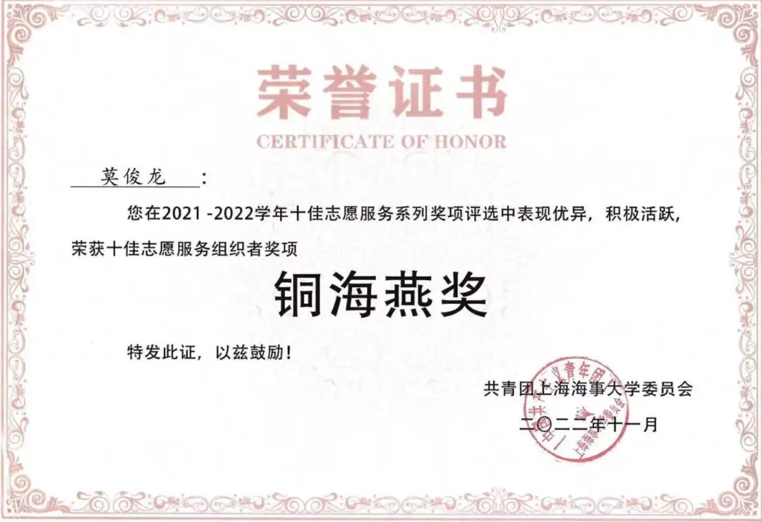 2021-2022学年 上海海事大学十佳志愿服务组织者奖项“铜海燕奖”