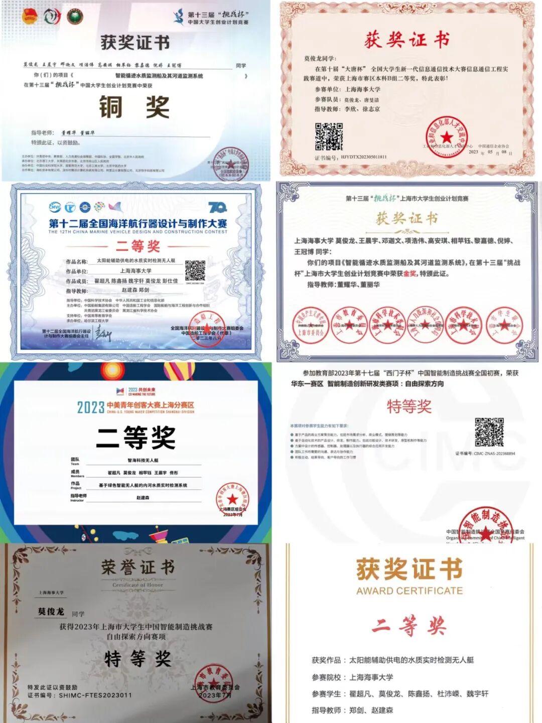 在专业课程学习过程中,莫俊龙掌握了多种数学建模、芯片设计等方面的学习软件,更加扩大了他在竞赛中的优势,也培养了他将所学运用到实践的操作能力。在海大校园里,也有许多机会结识志同道合的优秀同学一起组队参加科创比赛。在大学生涯中,莫俊龙荣获了多项国家级大奖,其中包括全国海洋航行器设计与制作大赛、全国大学生交通运输科技大赛以及“挑战杯”中国大学生创业计划竞赛等。他充分发挥自己专业所学,参与了多种航运、船舶相关的硬件设计开发,从整体机械架构设计、软件驱动、编写代码,到实验室焊接贴片,他用自己的专业知识架起软硬件的桥梁。