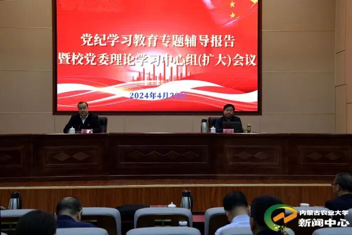 4月28日下午,学校在西校区八号教研楼召开党纪学习教育专题读书班辅导报告暨校党委理论学习中心组(扩大)会议。党委副书记董贵成,副校长塔娜,党委委员、纪委书记褚亚申,党委委员、副校长陆海平、左合君、董同力嘎出席报告会,党委副书记董贵成主持会议,全体处级干部参加会议。