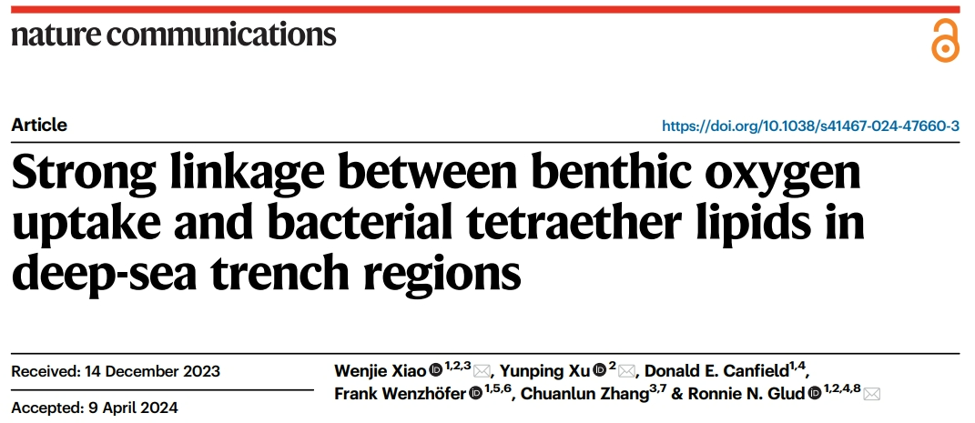 近日,国际学术期刊《自然-通讯》(Nature Communications)在线刊登了上海海洋大学极端海洋研究团队与合作者的最新研究成果《Strong linkage between benthic oxygen uptake and bacterial tetraether lipids in deep-sea trench regions》(海沟区域底栖耗氧与细菌四醚膜脂化合物的强关联性)。该论文以三条太平洋深渊海沟为研究对象,分析了沉积物中来自细菌微生物的细胞膜脂化合物,并结合文献数据,提出了一个能够灵敏指示沉积物耗氧速率的新指标。该工作对于定量评估深海微生物活动强度和沉积有机碳的分解与保存具有重要意义。