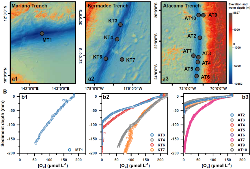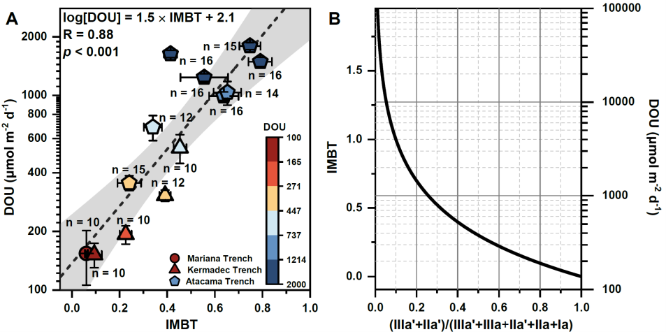 论文聚焦海洋底栖细菌产生的一类特殊的细胞膜脂生物标志物——细菌甘油二烷基甘油四醚化合物(英文简称:brGDGTs)。早期大量的研究发现细菌可以通过改变brGDGTs 的支链甲基数目、五元环的数目和位置来适应环境变化。最近的研究指出氧气是影响细菌brGDGTs 合成的关键因素,然而目前对于brGDGTs 分子是否可以用来定量指示海洋氧气消耗尚不清楚。作者从阿塔卡马海沟、克马德克海沟和马里亚纳海沟采集了数十根沉积柱,水深范围从4045米到10100米。这些海沟沉积物处于长期的高压和低温极端环境,其沉积有机碳主要来自海洋生物的贡献。这三条海沟位于不同生产力水域,分别为贫营养的马里亚纳海沟、中营养的克马德克海沟和富营养的阿塔卡马海沟。由于俯冲带海沟地震引起的快速堆积,这些沉积物的溶解氧含量随着沉积深度呈现快速的变化,其中扩散耗氧速率DOU的变化范围相差数十倍,意味着这些海沟具有明显不同的微生物活动强度。因此,深渊海沟是一个检验brGDGTs能否作为耗氧指标的理想场所。