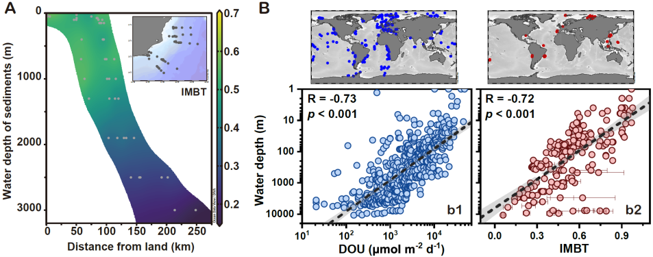 研究结果显示,无论是海沟间还是海沟内部,氧气扩散速率DOU都是影响brGDGTs组成和分布的最重要因素。基于DOU与不同brGDGTs化合物之间的强相关性,研究团队建立了异构-甲基化指标(英文缩写:IMBT)。IMBT指标反映了无环brGDGTs的异构化和甲基化程度,与DOU之间表现出显著的相关性(r = 0.88;P < 0.001;图2)。在此基础上,论文整合了已发表的全球海洋数据,结果显示无论是在区域尺度还是全球尺度,IMBT指标与DOU之间都呈现随水深增加而下降的趋势(图3),该结果支持IMBT指标的广泛适用性。